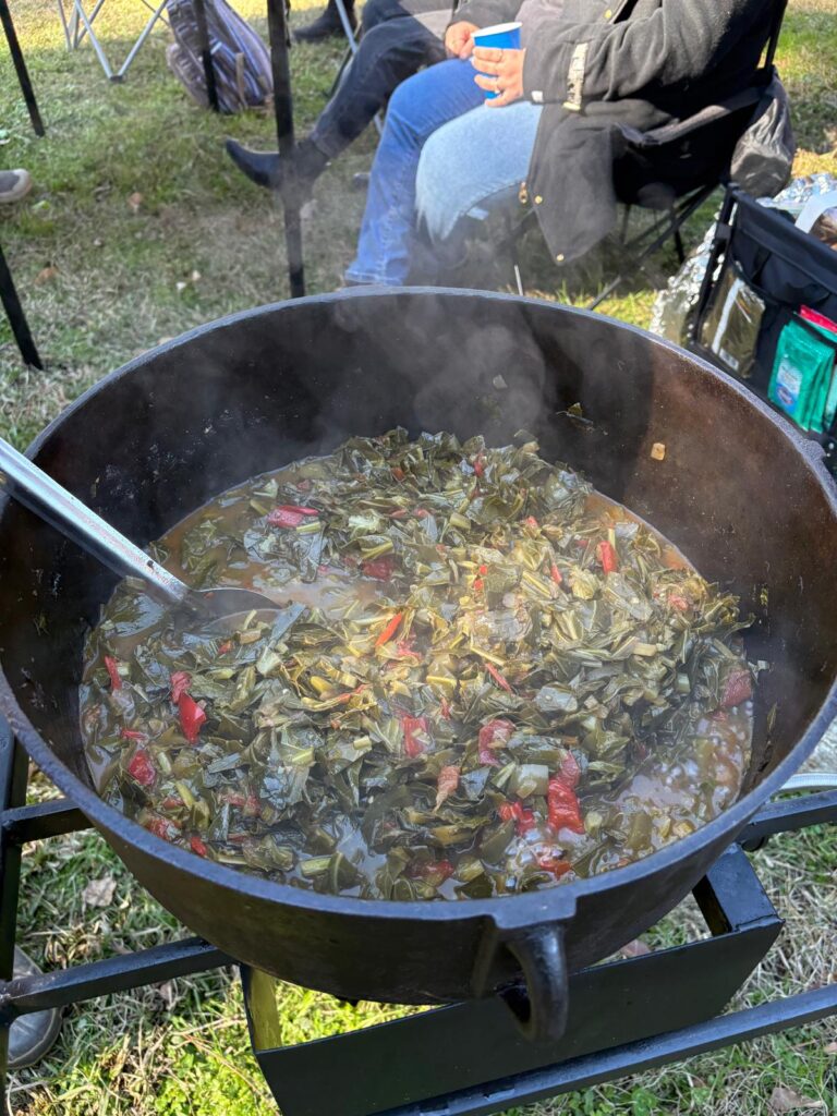 In Ridgeville, South Carolina I witnessed a lot of that too. I was invited to a hog killing out there. It’s the second one I’ve ever been to. This one had no entrance fee, loud music, and bout every two feet you walked, there was another cast iron pot or grill cooking something up and you were welcome to it. These hog killings (or boucheries) are long-held traditions in pork-eating communities. Early in the morning, a hog is sacrificed, a prayer of thanksgiving is shared, the hog is cleaned and broken down by as many hands as possible, and, throughout the day and evening, various cuts of meats are cooked onsite as well as preserved to feed families for months. It’s A LOT of work, but it’s done together and joyfully.
